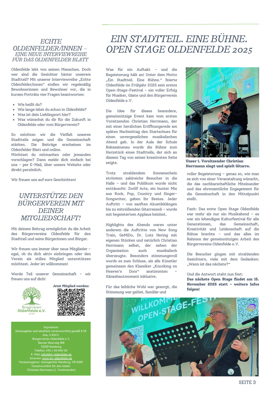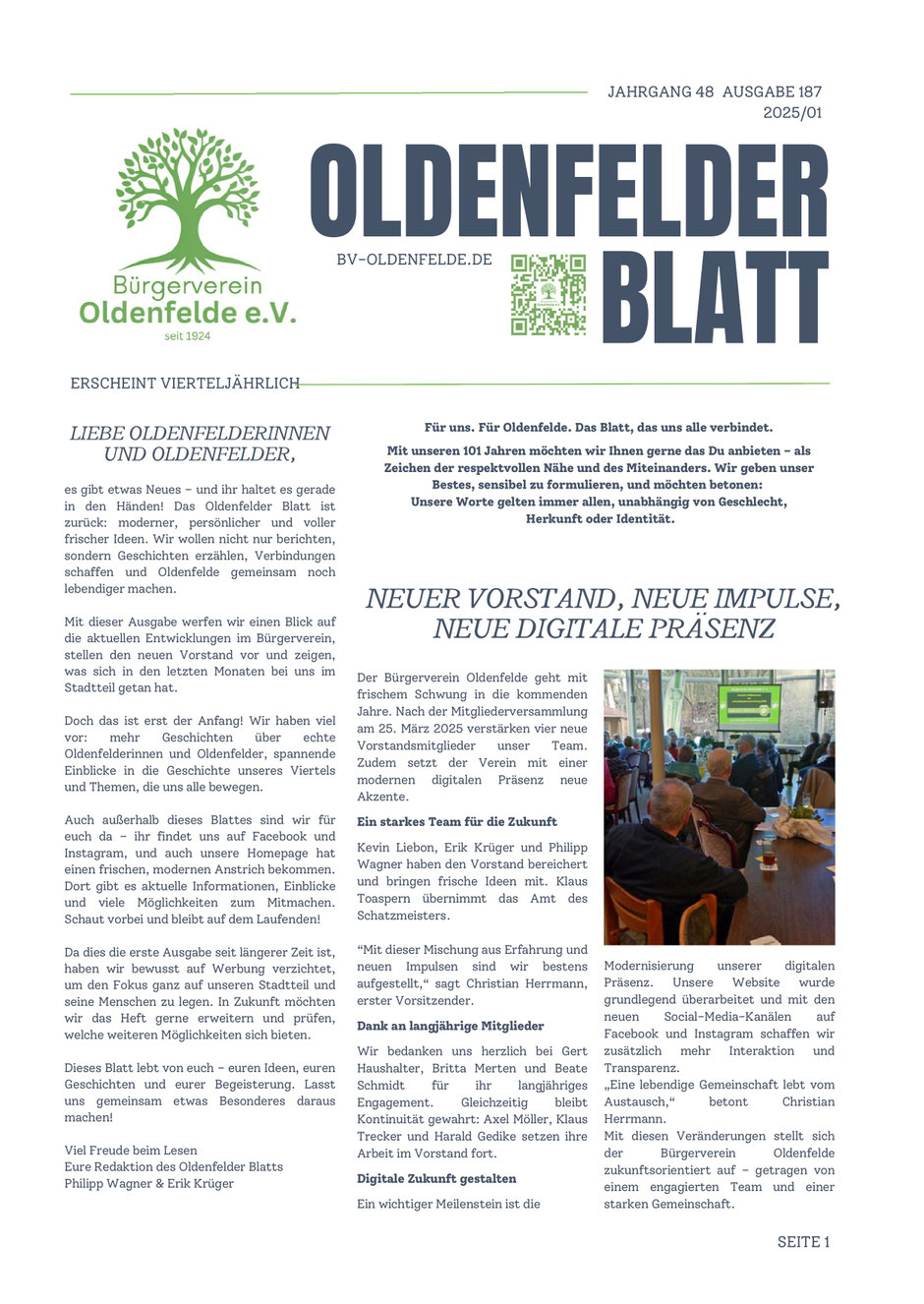 es gibt etwas Neues – das Oldenfelder Blatt ist zurück: moderner, persönlicher und voller frischer Ideen. Wir wollen nicht nur berichten, sondern Geschichten erzählen, Verbindungen schaffen und Oldenfelde gemeinsam noch lebendiger machen.
